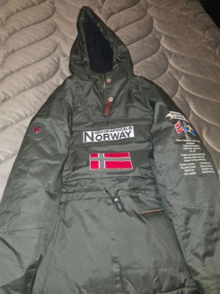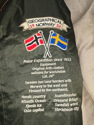 Casaco verde da Geographical Norway, ideal para chuva, neve e vento. Com um design inspirado na expedição polar e nas paisagens nórdicas. - Design inspirado em Polar Expedition since 1953. - Detalhes com as bandeiras da Noruega e Suécia. - Bordado com Geographical 19 Norway 53. - Informações sobre a geografia nórdica e a capital Oslo. - Tecido original para climas frios.