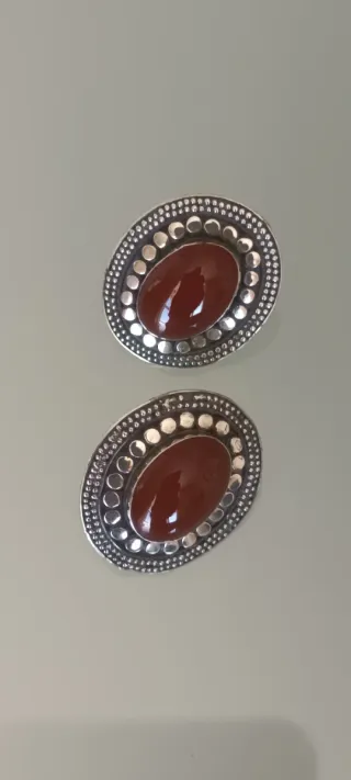 Par de brincos antigos em prata com uma pedra central de cor vermelha. 2,5cm. de comprimento por 2cm. de largura. - Design oval com detalhes em relevo. - Acabamento em prata. - Pedra com tonalidade vermelha intensa.