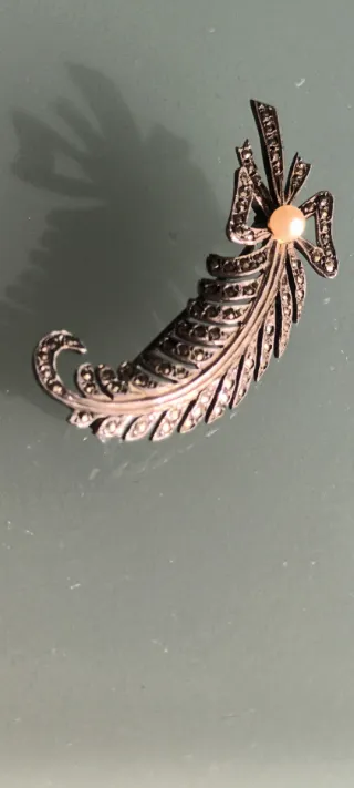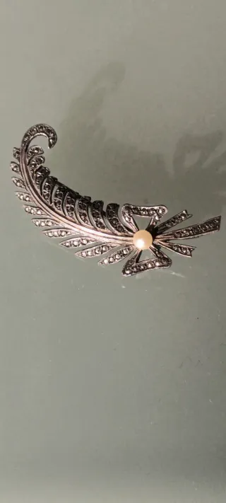 Lindo e elegante alfinete antigo de prata, com marcassitas e pérola. Mede 4.5cm. de comprimento.