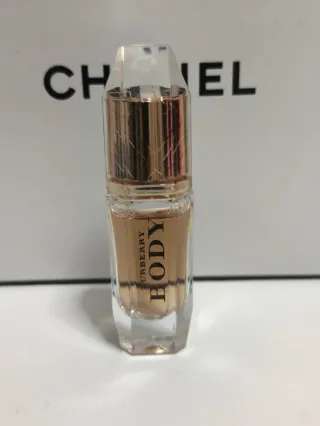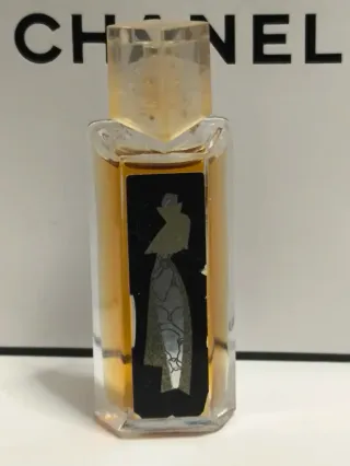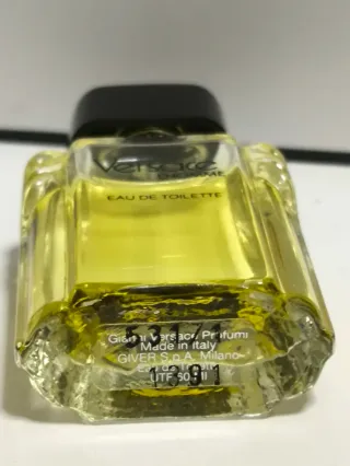 Frasco Givenchy Hot couture 5ml. 1°formula - Frasco de vidro com líquido dourado. - Rótulo preto com silhueta de figura feminina.