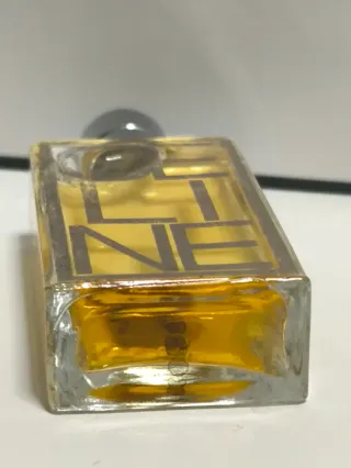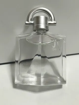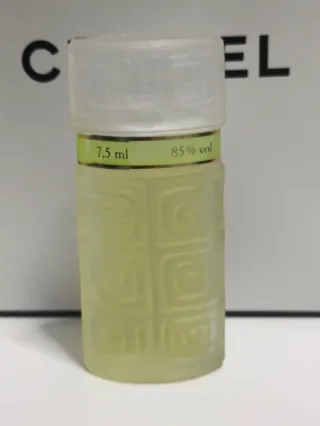 Frasco de perfume Courrèges com um design elegante.5ml. - Frasco de vidro transparente. - Detalhes prateados no frasco e na tampa. - Padrão Courrèges repetido no vidro.
