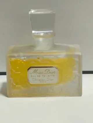 Fragrância clássica Miss Dior Eau de Toilette. 5ml - Frasco de vidro com tampa. - Líquido amarelado no interior.