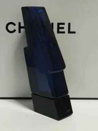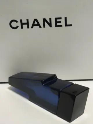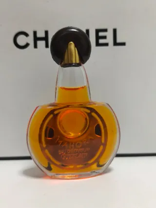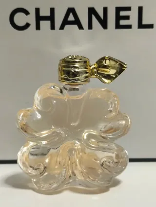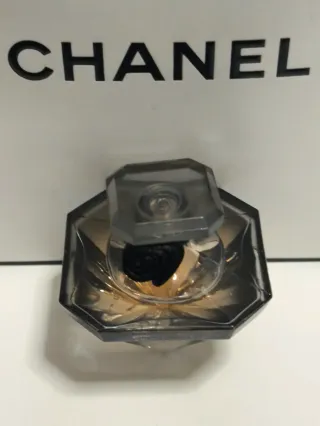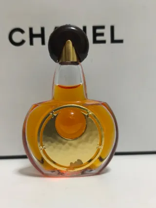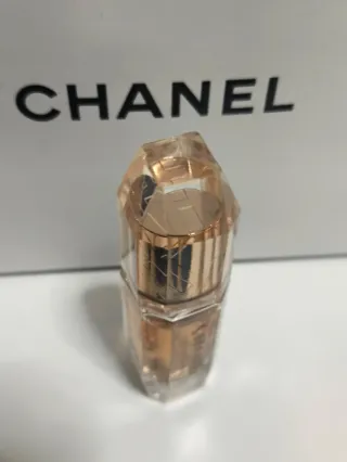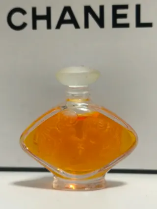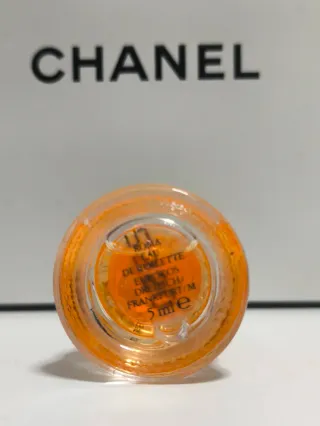 Fragrância Chanel em frasco de vidro. Miniatura - Frasco com relevos decorativos. - Líquido de cor laranja vibrante.