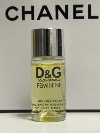 Colónia D&G Feminine da Dolce & Gabbana. Um aroma delicado e fresco. Miniatura muito raro - Frasco de vidro com tampa prateada. - Líquido dourado.