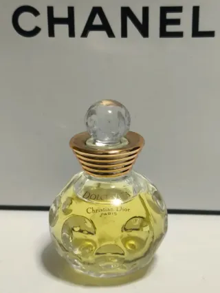 Fragrância feminina da Christian Dior, em embalagem de colecionador. 5ml. - Frasco de vidro com detalhes em relevo. - Tampa dourada e transparente.