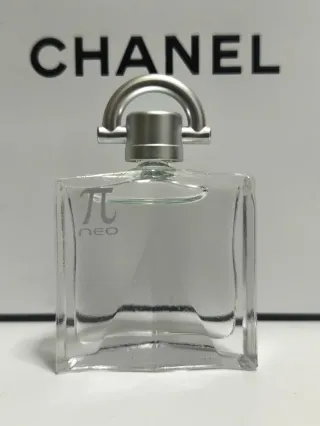 Fragrância Givenchy Pi Neo em frasco de vidro. 5ml. - Design moderno e minimalista. - Frasco transparente com detalhes em prata.