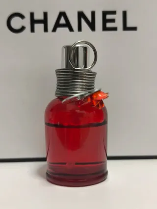 Colónia da Chanel com um frasco vermelho e detalhes prateados. Miniatura - Frasco de vidro com líquido vermelho. - Tampa prateada com anel. - Detalhe de flor e folha em metal.