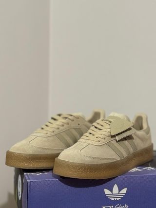 Sapatilhas Adidas Samba em tom bege, com um design clássico e versátil. A sola em borracha confere um toque moderno e duradouro. - Material exterior em camurça. - Três riscas laterais icónicas. - Sola de borracha com textura.