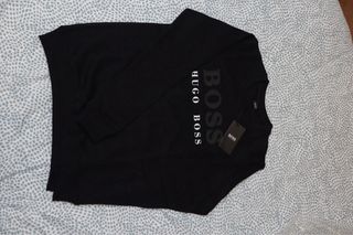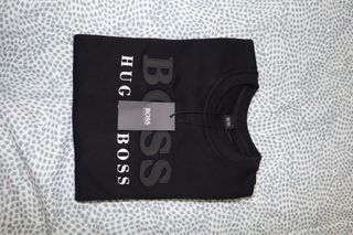Camisola preta da marca BOSS com um design moderno e elegante. - Logo BOSS em relevo na frente. - Etiqueta com a marca visível na gola.