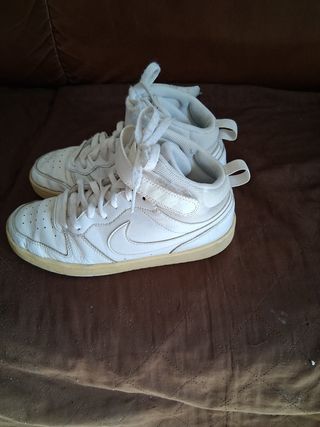 Tenho para venda estes ténis Nike brancos de cano médio. São dois ténis, usados, mas em bom estado. - Modelo botim. - Atacadores brancos. - Sola bege.