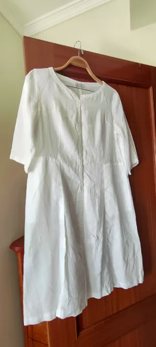 Vestido de linho da marca Rosso 35, em branco e tamanho L/40./XL/42. Na etiqueta diz 46 más aconselho para 40/42, veja às medidas na descrição. Tem bolsos laterais, e fecho lateral - Cava a cava 54,5 cm - Anca 54,5 cm - Comprimento total 103 cm - Tecido de linho. - Design elegante e confortável.