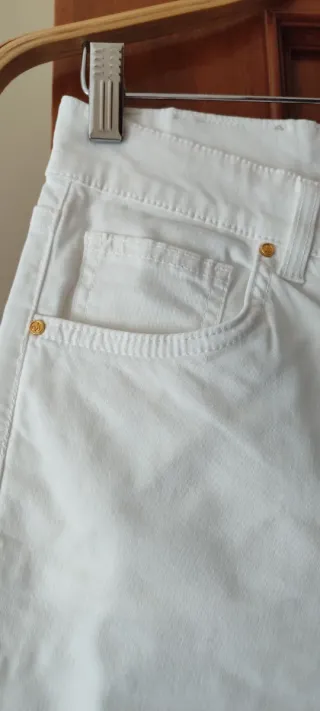 Calças de ganga de corte reto em branco, com um pouco de elasticidade usado apenas uma única vez. - Cintura subida, de 40 cm - Anca 50 cm - Comprimento total 87 cm - Bolsos frontais e traseiros. - Fecho de botão e fecho de correr.