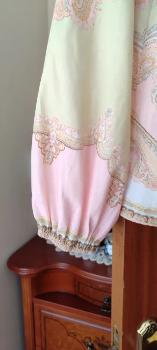 Conjunto de camisa e calções com um padrão vibrante e cores alegres. Peça nova, nunca usada. Comprada em Marrocos - Camisa de manga comprida com fecho de botões. Medidas: - Cava a cava 52 cm - Comprimento total 64,5 cm - Calções confortáveis com fecho ziper, cintura subida de 49 cm - Comprimento total de 39 cm - Com bolsos laterais
