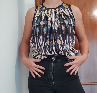 Blusa colorida, com tecido fluido e pormenor de assimetria na frente. Manga cavada. Versátil. Da marca SMF. Veste do S ao L. Zona da cintura com elástico que ajusta ao corpo.