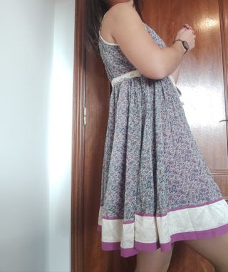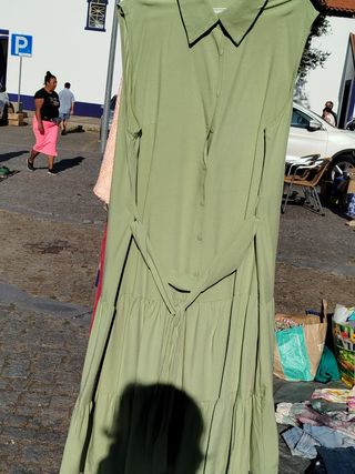 Vestido usado uma única vez, numa cerimónia. Com forro. Alças ajustáveis. Peças cor de pérola nas alças e nas tira do laço.