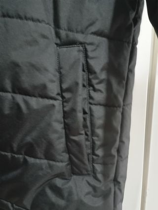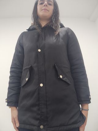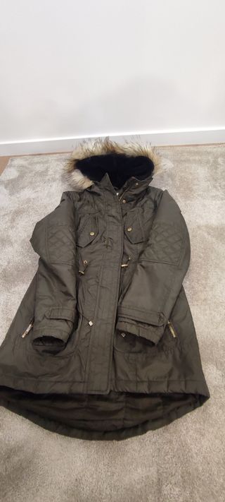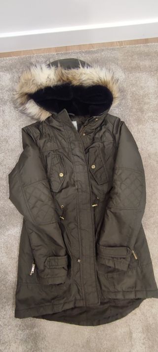 Casaco, acolchoado, com capuz de pêlo. É de adolescente (13-14 anos), mas eu uso-o como XS/S. Em muito bom estado. Único defeito (falta a peça da mola do bolso esquerdo (como se vê na foto). Facilmente se arranja. E com o bolso fechado não se vê. Quentinho. Ajustável ao nível da cintura (caso pretendam). Forro sem nenhum defeito.