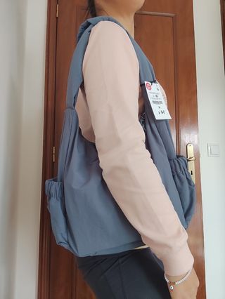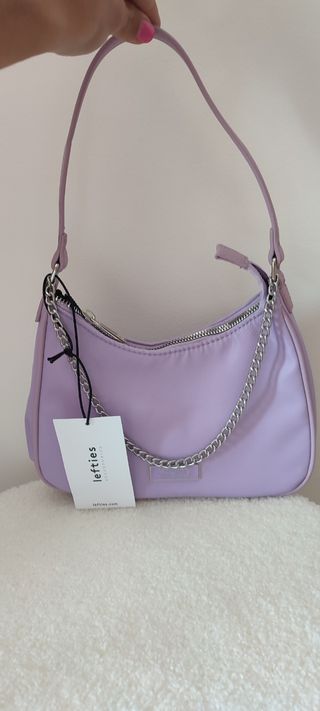 bolsa de ombro lilás. Leva o essencial. Fecho zíper.