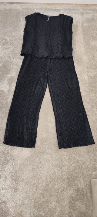 Conjunto elegante composto por top e calças compridas. O tecido é plissado e tem um aspeto sofisticado. Ideal para um look moderno e confortável. - Peças em excelente estado. - Tecido plissado. - Corte moderno.