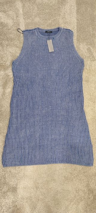 Vestido de malha, azul matizado e canelado. Confortável e nada pesado. Tamanho M/L, mas também veste S. Medidas nas fotos. Novo.