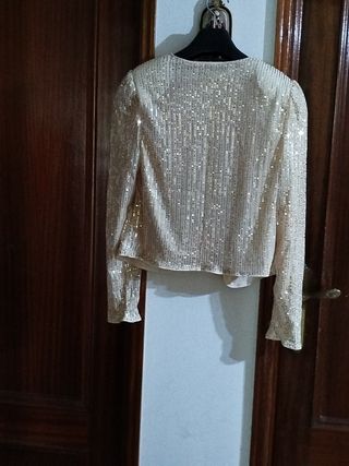 Casaco feminino, ideal para ocasiões especiais. Apresenta um design elegante e sofisticado. - Confeccionado com tecido brilhante. - Detalhes em lantejoulas douradas. - Modelo de manga comprida. - Corte reto.