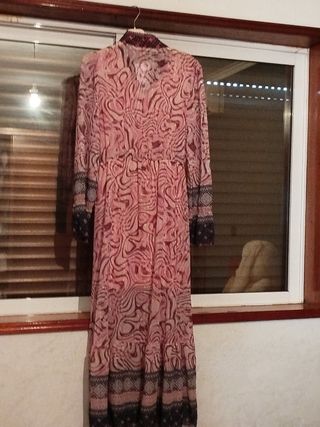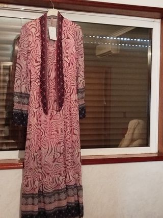 Vestido feminino tamanho M, com um padrão único e elegante. Ideal para diversas ocasiões. - Tecido leve e fluido. - Manga comprida. - Detalhes em roxo e rosa. - Perfeito para um look casual ou mais sofisticado.