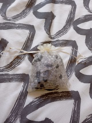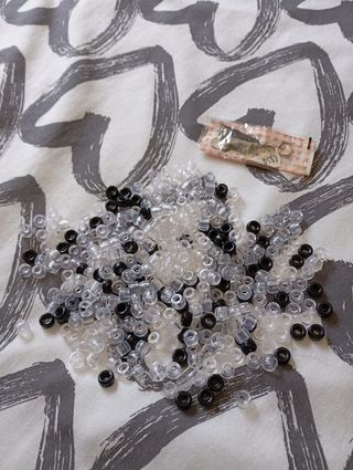 Conjunto de missangas pretas e brancas, perfeitas para criar tranças originais e estilosas. - Ideal para trabalhos manuais e criações personalizadas. - As missangas encontram-se em bom estado. - Inclui aproximadamente 100 missangas.