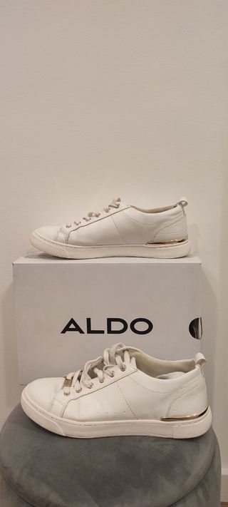 Tenho um par de sapatilhas Aldo para venda. São brancas e têm um design elegante e minimalista. - Material: Couro sintético - Detalhe dourado na lateral - Sola branca - Tamanho: 37,t - Em bom estado: Pequeno defeito no interior, no forro, em cada sapatilha, tal como demonstrado na fotografia, não comprometendo em nada o conforto e o visual da sapatilha e quando calçado é completamente invisível. Vai em caixa original, ainda com papel a envolver as sapatilhas, mais compressas de limpeza da mesma marca.