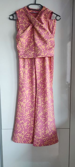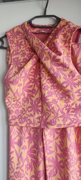 Conjunto Zara de duas peças, top e calças. O conjunto é de cor laranja e rosa, com um padrão floral. As peças são novas. - Top com detalhe cruzado na frente. - Calças com corte flare. - Tecido leve e confortável por ser elástico.