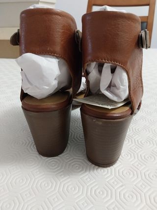 Sandálias de salto castanho, em pele. Estão novas, sem uso. - Salto grosso e confortável. - Fecho com fivela no tornozelo. - Detalhe de recorte na frente. - Perfeitas para o verão!