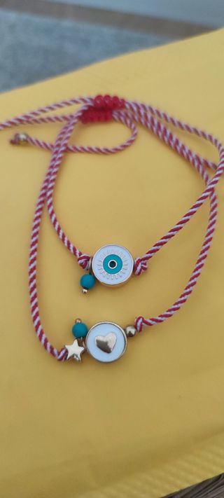 Duas pulseiras delicadas e charmosas, perfeitas para adicionar um toque de estilo ao seu visual. - Uma pulseira apresenta um pingente de olho grego, símbolo de proteção. - A outra pulseira tem um pingente em formato de coração. - As pulseiras são feitas com cordão vermelho e branco e detalhes em turquesa. - Novas. - para usar em conjunto ou separado.