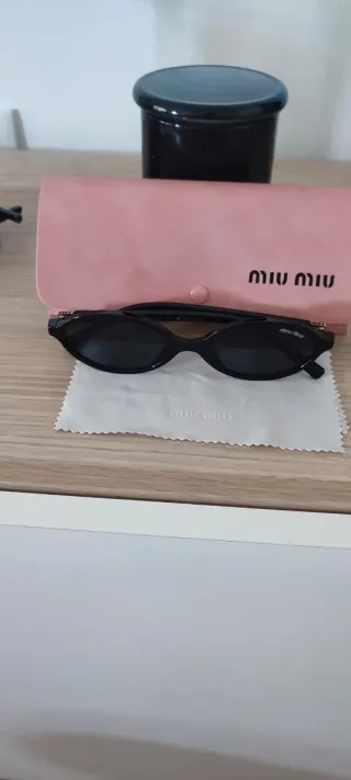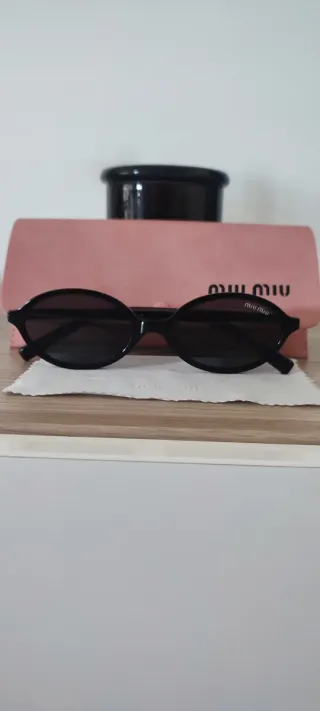 Usados, mas sem marcas. - Armação preta. - Lentes escuras. - Formato oval. - Pormenor da marca em dourado.