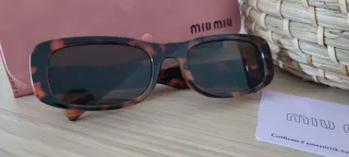 Óculos de sol Miu Miu com padrão tartaruga. - Armação em acetato. - Lentes escuras. - usados, mas sem marcas