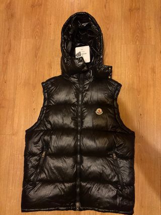 Colete Moncler preto, nunca usado e com etiquetas. - Tamanho L. - Fecho frontal. - Bolsos laterais com fecho. - Capuz.