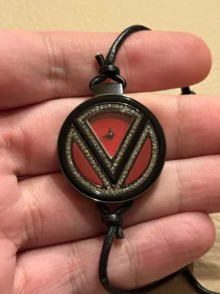 For sale is a Valentino watch, possibly from the early 2000s. It features the iconic ‘V’ logo on the dial and a leather string that makes it wear more like a bracelet and less like a watch. Powered by a Swiss quartz. movement, it’s the perfect mix of fashion and watchmaking. Condition: Unworn. It includes the original hangtag. These originally retailed for €450. Case Size: 30mm Movement: Swiss quartz movement.