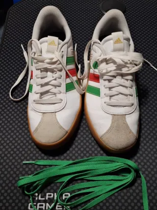 Sapatilhas Adidas em branco com detalhes em verde e vermelho nas icónicas três riscas. - Sapatilhas de atacadores. - Detalhes em camurça. - Sola de borracha. - Inclui atacadores verdes extra.