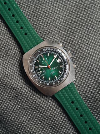 For sale is a vintage Plimex Aquapearl 50, possibly from the 70s. It features a chrome-plated case and it’s powered by a reliable Swiss manual wind movement. The watch also has a funky green dial that further adds to the vintage charm. Condition: Very good. Some usage marks on the case, but it still looks great for its age. Please see the pictures for full condition and clarity. Case Size: 30.9 x 28.5mm chrome-plated case with a thickness of 10.3mm. Movement: Swiss manual wind movement in good working condition. Service history is unknown.