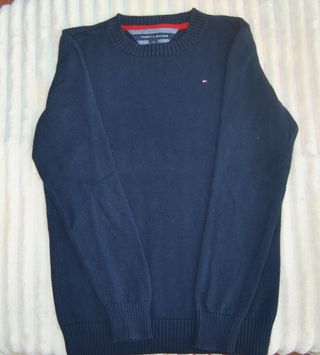 Camisola clássica de malha da Tommy Hilfiger em excelente estado. Peça com o icónico logótipo da bandeira bordado no peito. Ideal para um look casual ou escolar, com malha confortável e gola redonda. Marca: Tommy Hilfiger Cor: Azul Marinho (Navy) Tamanho na etiqueta: L/G (16/18 anos) - corresponde a um XS de adulto Estado: Artigo usado em muito bom estado de conservação Detalhes: Gola, punhos e base em malha canelada; detalhe em contraste vermelho e cinza no interior da gola