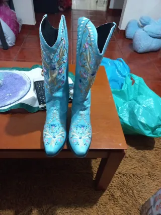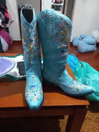 Botas de cowboy com um design único e vibrante. - Detalhes bordados florais e em espiral. - Acabamento em camurça sintética. - Ponta fina e salto baixo.
