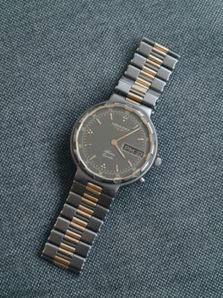 A very cool piece from the era when Longines was experimenting heavily with technology. This Conquest Alarm features a titanium case with gold-plated accents, nailing that late 80s two-tone look while feeling extremely light on the wrist. Condition: Good for its age. The titanium case has minor usage marks, but the bracelet shows some wear. The dial looks impressive, without any markings or patina. Please see the pictures for a better description. Case Size: 33.2 x 37.1mm titanium case with a thickness of 7.6mm.