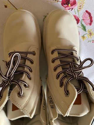 Botas de cano alto da Guess em branco e castanho. - Fecho lateral com fecho de correr. - Cadarços com padrão. - Detalhe de etiqueta em pele.