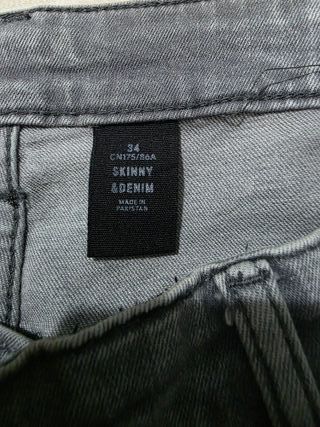 Calças de ganga cinzentas com efeito lavado, ideais para um look casual e moderno. O tecido tem alguma elasticidade para maior conforto. Detalhes técnicos: Fecho: Botões metálicos (Button fly). Composição: 98% Algodão, 2% Elastano (proporciona o ajuste "stretch"). Cor: Cinzento médio/escuro com lavagem estonada. Bolsos: Modelo clássico de 5 bolsos. Tamanho e Medidas:44 (L) / 34 (US/UK) Tamanho na etiqueta: 34 (Equivale a um 44 em Portugal/Espanha para homem). Referência na etiqueta: CN 175/86A.