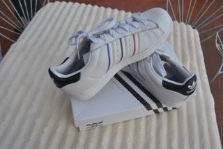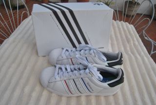 Vendo sapatilhas Adidas Superstar originais, num modelo diferenciado com as icónicas três riscas em azul, preto e vermelho. Estão em muito bom estado, como mostram as fotos, e prontas a usar. Destaques: Design Único: Detalhes em azul e vermelho nas riscas laterais e um pormenor verde discreto na zona do calcanhar. Qualidade: Construção clássica em pele, com a icónica biqueira "shell toe". Estado: Muito bem estimadas, couro sem marcas profundas e sola com pouco desgaste. Detalhes técnico - Design icônico com as três listras. - Detalhes em preto e verde no calcanhar. - Cadarços brancos.