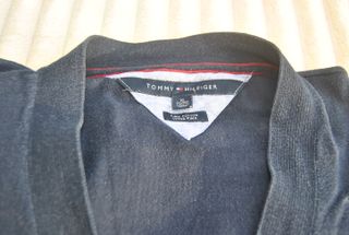 Como novo / Muito bom estado Marca: Tommy Hilfiger (Original) Tamanho: L (Grande) Material: 100% Algodão Premium (Coton Prestige) Detalhes da peça: Cor: Cinzento escuro mesclado (Antracite). Design: Corte clássico com gola em V e fecho de botões frontais. Acabamentos: Detalhe com as cores icónicas da marca (azul, branco e vermelho) no interior da gola e no punho. Logótipo: Bandeira clássica bordada no peito. Toque: Tecido muito macio, leve e de alta qualidade, ideal para meia-estação ou sobreposições.