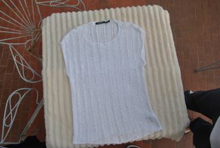 Elegante Top/Camisola sem mangas da prestigiada marca Lauren Ralph Lauren. Esta peça destaca-se pelo seu design em malha calada (croché/tricô aberto) com riscas verticais que alongam a silhueta. É uma peça muito versátil, perfeita para um look "Old Money" ou casual chic de verão. Marca: Lauren Ralph Lauren (Original) Cor: Branco / Off-white Tamanho: M Composição de Alta Qualidade: 46% Linho, 30% Viscose, 14% Algodão, 10% Poliéster (proporciona um toque fresco e ótimo cair). Estado: Artigo usado, mas em excelentes condições, muito bem cuidado. Detalhes: Decote redondo, corte direito e sem mangas (estilo "cap sleeve").