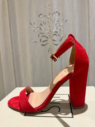 Sandália de salto alto da marca Universo do Sapato, tamanho 38. - Cor vermelha vibrante. - Design com tira no tornozelo e fechamento em fivela. - Material com acabamento aveludado.