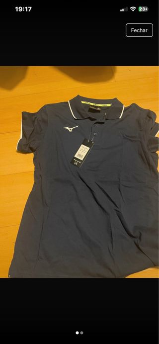 Polo desportivo da marca Mizuno, em tom azul. - Gola polo com detalhe branco. - Mangas curtas com detalhe branco. - Logótipo da marca bordado no peito.