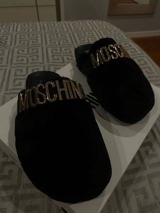 Chinelo da Moschino em preto com detalhes dourados. - Design moderno e confortável. - Logo da marca em metal dourado na tira. - Preço negociável - usado uma vez