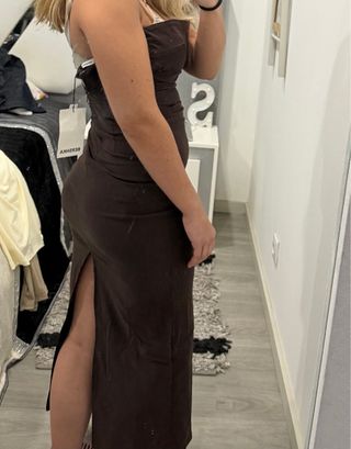 Vestido comprido em tom castanho. - Design elegante e moderno. - Tecido macio e confortável.