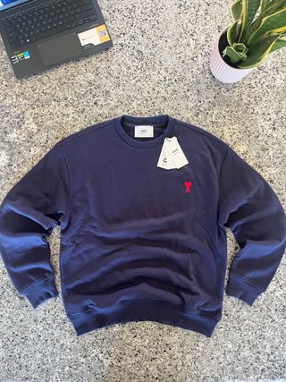 Sweatshirt da AMI Paris em azul marinho com o icónico coração vermelho bordado no peito. - Gola redonda. - Mangas compridas. - Punhos e bainha canelados.