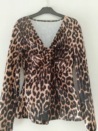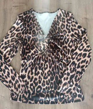 Camisola com padrão leopardo. - Decote em V torcido. - Manga comprida. - Tecido leve e confortável.